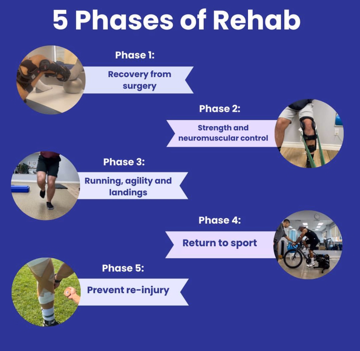 After ACL surgery, your physiotherapist (PT) will design a customized rehab plan tailored to your body, goals, and progress. While everyone heals differently, rehab follows structured phases to safely rebuild strength, mobility, and confidence.